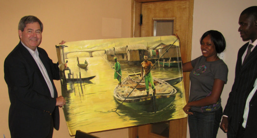 Last night, my class presented me with a hand painted canvas titled “Every Day Life” that depicts fishing and travel on the water near Lagos Bridge. The city of Lagos is on an island and is somewhere around 7 million people, , , to say the streets are quite busy is an understatement.