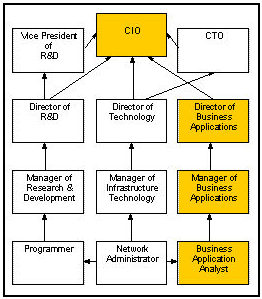 If you know that 70% or more CIO positions are filled from the Business Applications side, it’s logical to pursue the path of the boxes that are filled in. Another route is to follow a vertical path that leads to Manager of Infrastructure and then to Director of Technology. At this position, the possibility of filling a CIO role is doable but possibly more remote. The CTO position is a strong logical next step from the Director of Technology position. From the CTO position, you can position yourself for the CIO role.