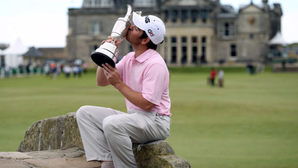 Louis Oosthuizen holds the claret jug trophy as he sits on the “old bridge with the St. Andrews clubhouse and 18th green in the background