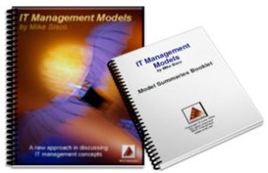 IT Management Models includes 72 models developed specifically for use in managing technology resources. The material is beneficial for IT managers, team leaders, project managers, and employees alike. Includes two publications: a 200-page reference document with model detail and a small Summary booklet to carry with you easily. The reference publication is a quick read and provides examples that can be used in any number of technology situations. Details at www.mde.net/cio/page20.html