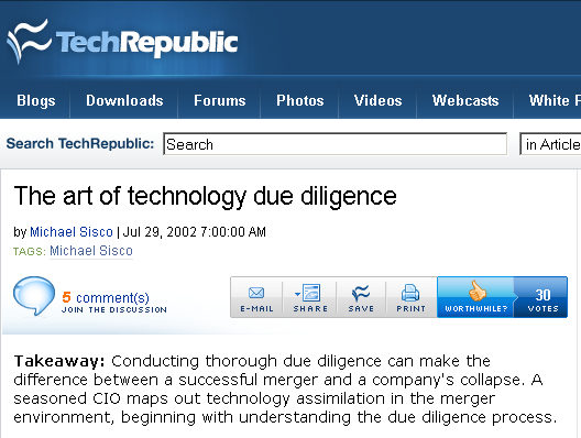 Projects seem to get bigger. We release the most comprehensive set of training and tools to support IT due diligence and assimilation work that’s based on the processes and tools I developed in participating in over 40 company acquisitions. This product bundle had been a goal for several years because of the popularity of my book, Acquistion: IT Due Diligence (our best single book seller), but I couldn’t seem to get to it.