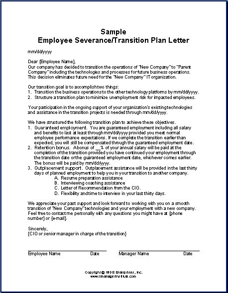 – The plan needs to have a guarantee of employment through the transition period, , , subject to normal employee performance and conduct. You have to make the employee feel secure in a situation that is very concerning for him.