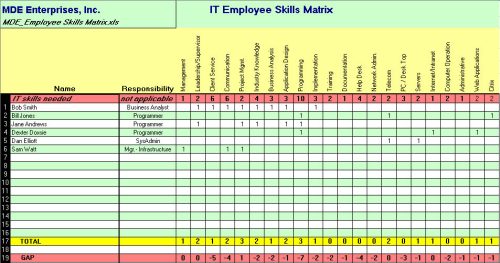 An IT employee skills inventory can be accomplished quickly and easily using a simple tool, an IT Employee Skills Matrix. You can also use this tool to list the number of resources you think you need for each skill, calculate the total number of people who have the skill and identify any skill gaps you might have.