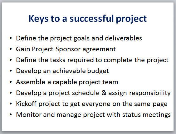 Slide-2: Next, lay out the three phases of project management (project definition, project development, and project execution). Then explain that 70% of a project’s success is based upon the planning (project definition and development) work done in the beginning before you actually start doing any of the project work.