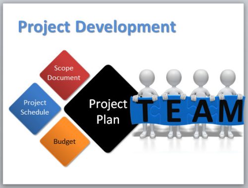 Slide #5: Phase 2 is Project Development. Once you know what is required (objectives and deliverables), you develop the project plan made up of the Project Scope document, Project Schedule, and Budget. When you have all the tasks identified, you know the skills required so you can assemble a competent project team.
