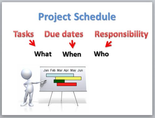 Slide #6: Developing the project schedule is a key part of the plan. It defines what needs to be done to complete the project (tasks), who should do the work, and when the work must be completed to deliver the project successfully.