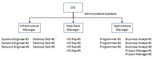 1.  Define your existing organization structure – First, you need to quantify your existing IT organization structure so you have a sense of the current positions. This is a standard Organization Chart that probably looks something like the chart below.